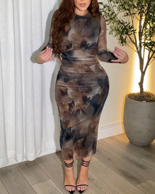 Tie Dye Mesh Long Sleeve Bodycon Midi Dress