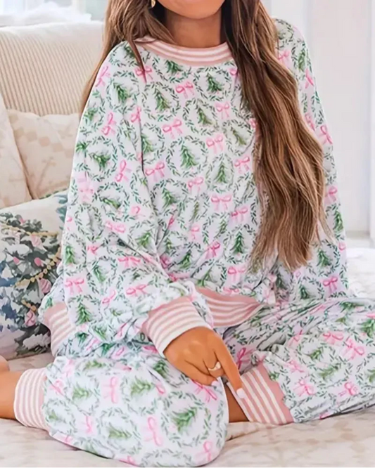 Women’s Christmas Loungewear Set – Tree & Bow Print Two-Piece Pajamas, Long Sleeve Top & Pants