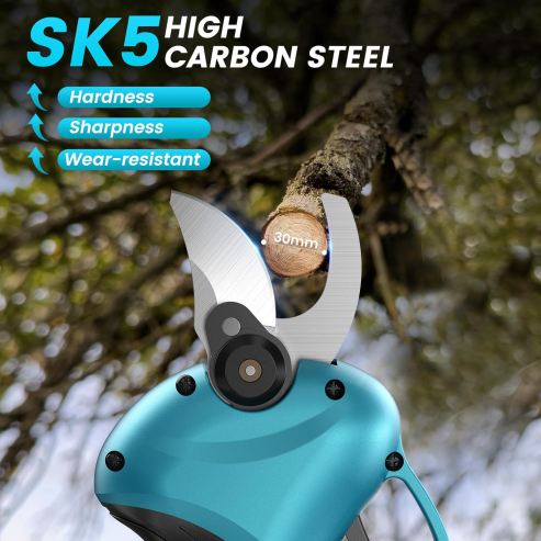 โ ใSk5 High Carbon Blade and Brushless MotorใOur pruning shears are equipped with 2 sets of SK5 high carbon blades (one installed) and an upgraded brushless motor. Compared with ordinary blades. SK5 has higher hardness and better wear resistance. which can support you to cut harder branches without worrying about damaging the blades. It is combined with an upgraded brushless motor. greatly improving the efficiency of the electric branch scissors for gardening.